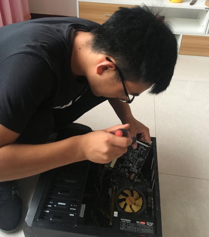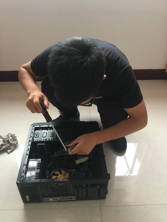 图为智能制造学院2016级电气2班班长于小桐同学,为社区机房维修、清理台式电脑。