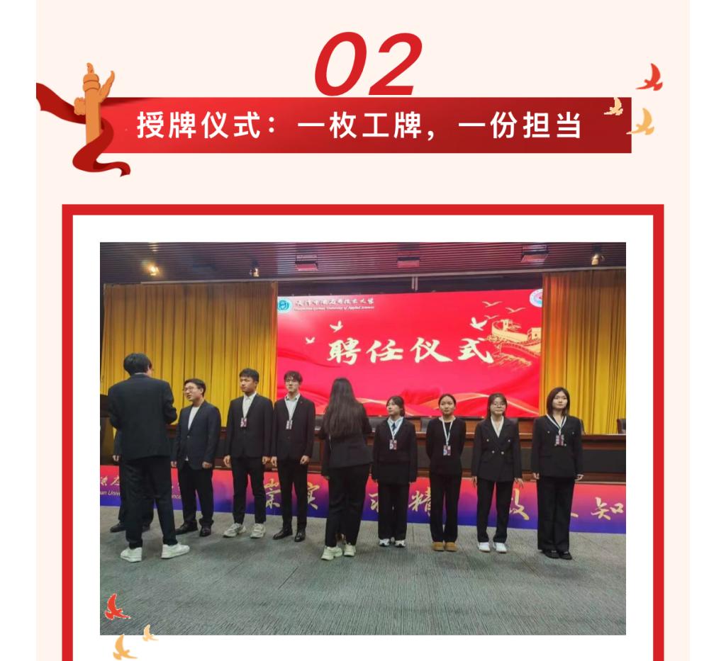 在庄重的音乐声中,各部门部长依次上台,为部门新聘任干事颁发工牌——这枚小小的工牌,镌刻着团委标识与部门名称,是身份的象征,更是责任的印记。接过工牌的瞬间,新干事们眼神坚定、精神抖擞,向部长致以敬意,也默默许下履职尽责、并肩前行的承诺,现场氛围庄重而热烈。