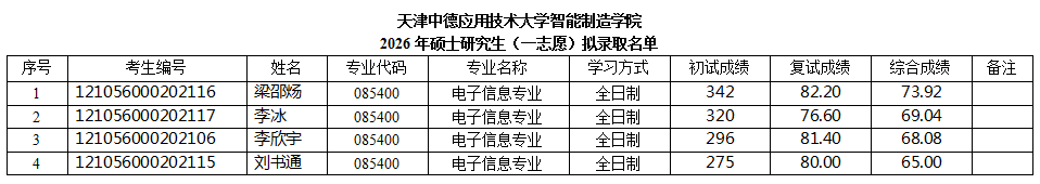 天津中德应用技术大学智能制造学院2026年硕士研究生(一志愿)拟录取名单公示