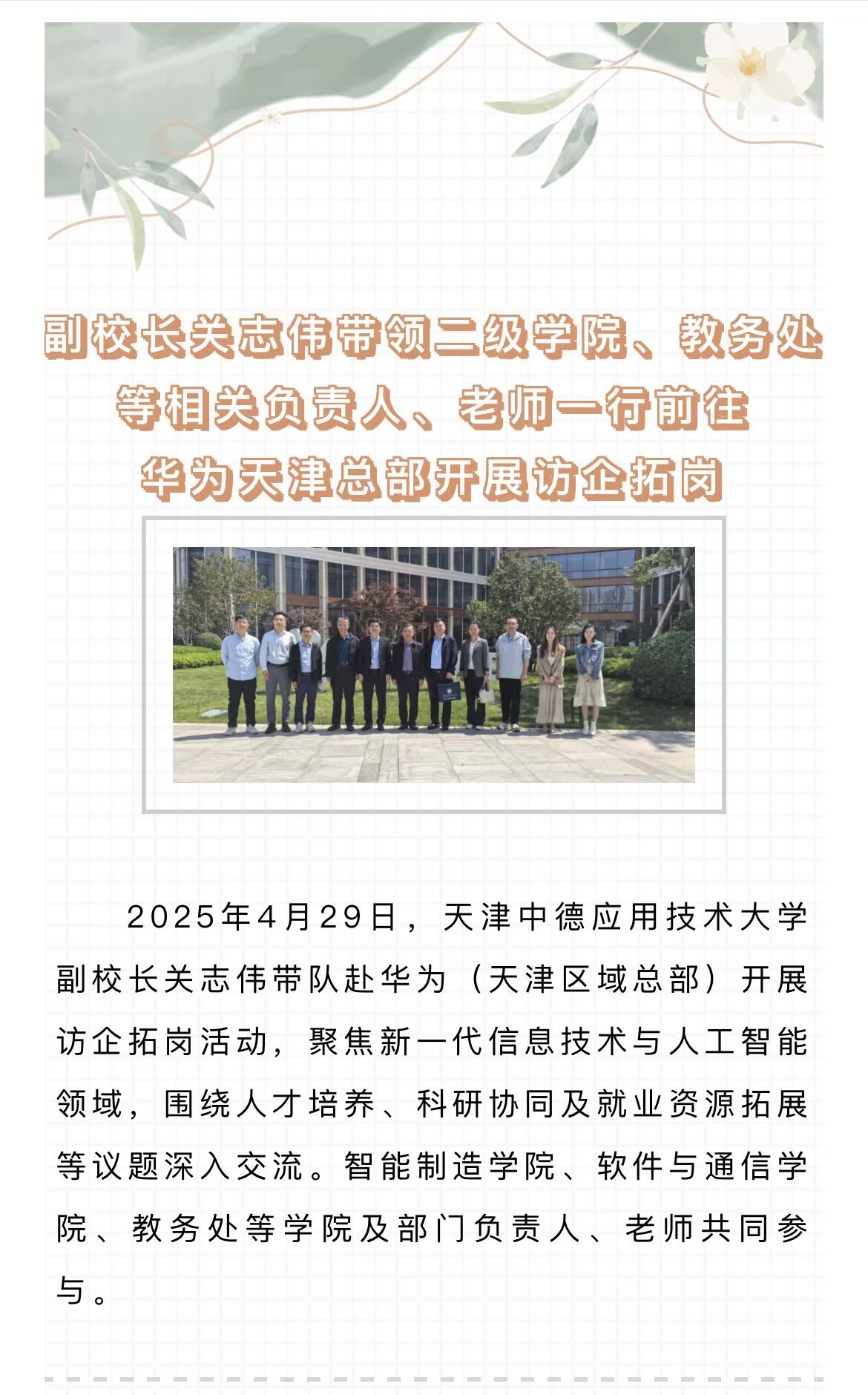 访企拓岗 | 深化校企协同 共育数智人才——副校长关志伟带领二级学院、教务处等相关负责人、教师一行前往华为天津总部开展访企拓岗