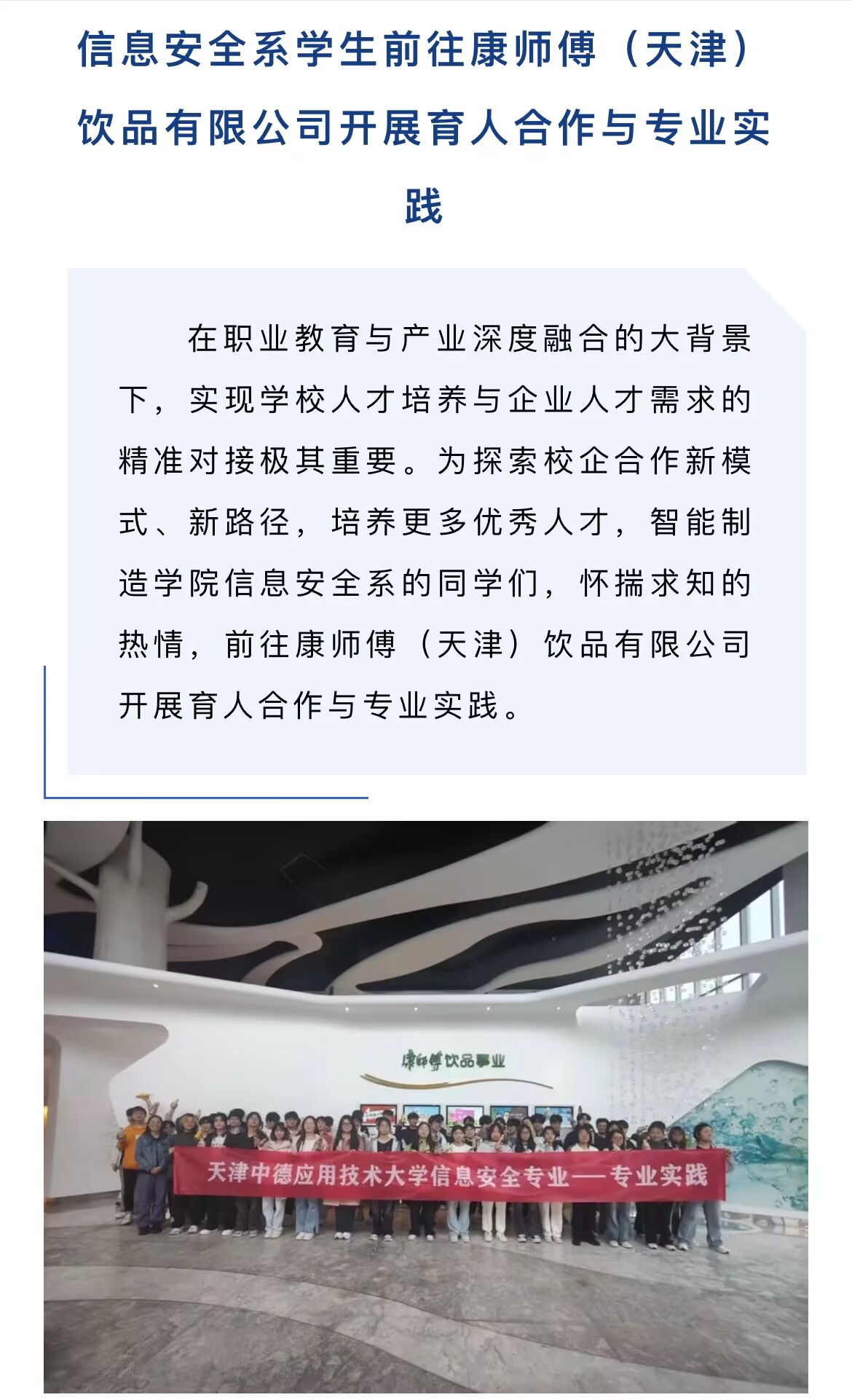 访企拓岗 | 校企携手,“育”见未来——智能制造学院信息安全系学生前往康师傅(天津)饮品有限公司开展育人合作与专业实践