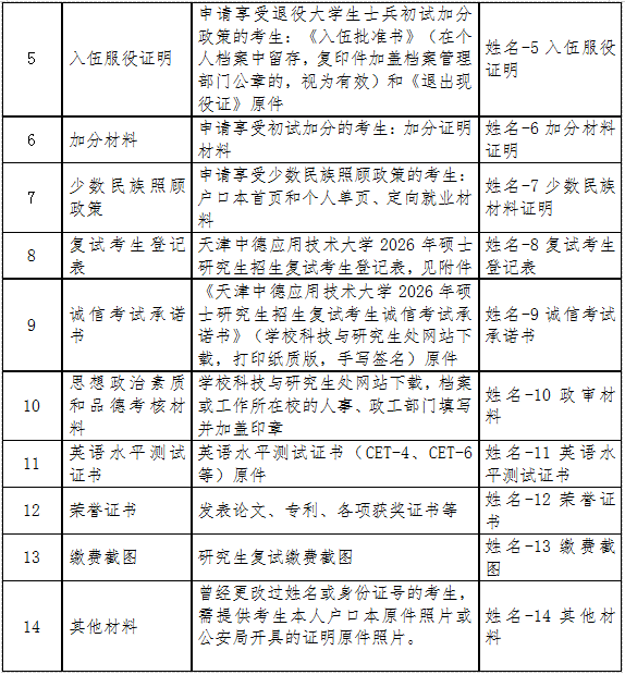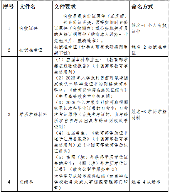4.考生收到复试通知并同意复试后,按照学院公布的要求,须在截止日期前将所有材料扫描成清晰的电子文件后整理成压缩包发送到znyjs@tsguas.edu.cn邮箱。压缩文件命名与邮件主题均为“调剂-姓名-参加复试”,凡未进行资格审查或资格审查未通过的考生一律不予复试和录取。复试时携带表格中资料原件。压缩包内文件详情如下:
